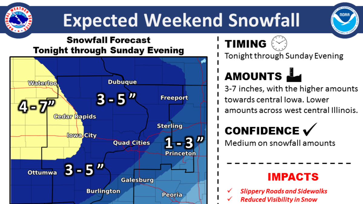 The National Weather Service is issuing a Winter Weather Advisory for the Quad Cities area, including Dubuque, Maquoketa, Clinton, Davenport, Bettendorf, Moline, Rock Island, and Aledo from Saturday night through Sunday night.