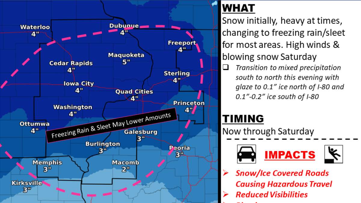 A Winter Storm Advisory is in effect in and surrounding the Quad Cities area and along the I-80 corridor both to the east and west of the Quad Cities.
