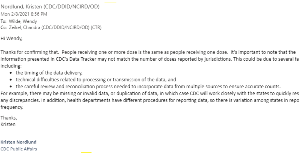 Thanks for confirming that. People receiving one or more dose is the same as people receiving one dose. It’s important to note that the information presented in CDC’s Data Tracker may not match the number of doses reported by jurisdictions. This could be due to several factors including: